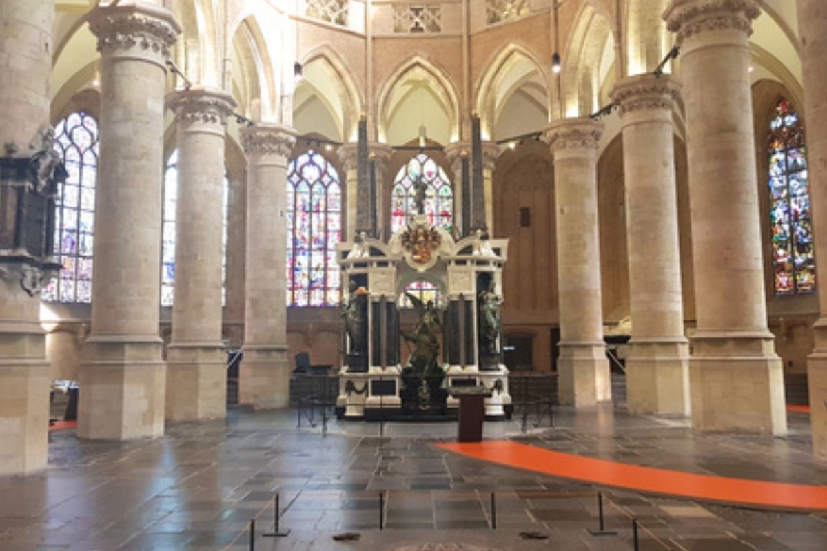 Binnen in de kerk bevindt zich het indrukwekkende praalgraf van Willem van Oranje. Het monument, rijk aan symboliek, markeert niet alleen zijn laatste rustplaats, maar ook het begin van een traditie: onder de kerk bevindt zich de grafkelder van het Koninklijk Huis. Wat betekende deze keuze voor Delft? En hoe groeide de kerk uit tot een plek van nationale herinnering?