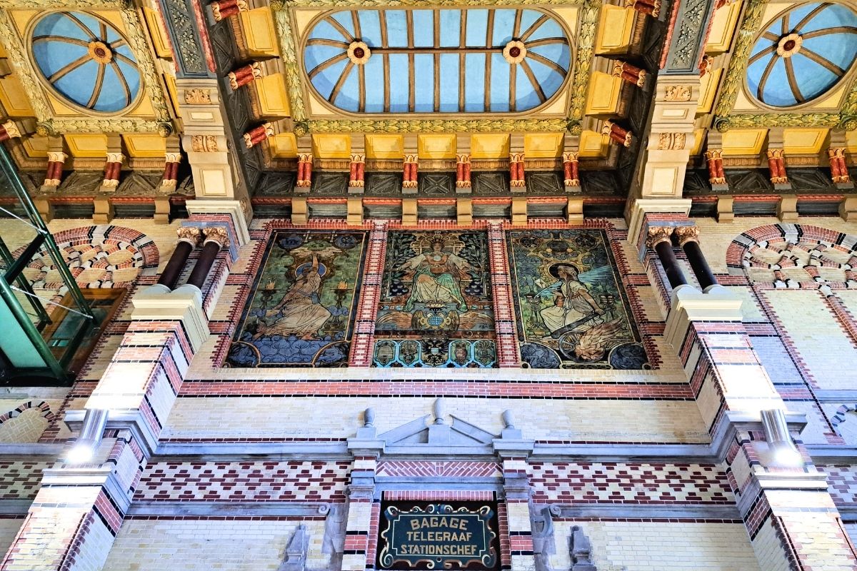 Binnen in Station Groningen openen zich wachtruimtes met sierlijke plafonds, muurschilderingen en gedetailleerd tegelwerk. De gids wijst op motieven die verwijzen naar landbouw, handel en nijverheid — pijlers van de Groningse economie rond 1900.